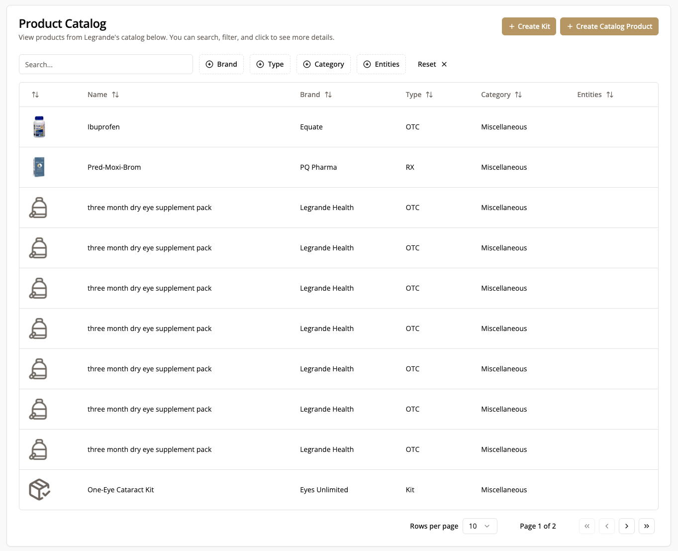 The product catalog is where products in the software get initially created in the software. Products in the catalog cannot be sold by Practices, Dispensers, or Manufacturers until products are added to an entity’s list of products from the product catalog.