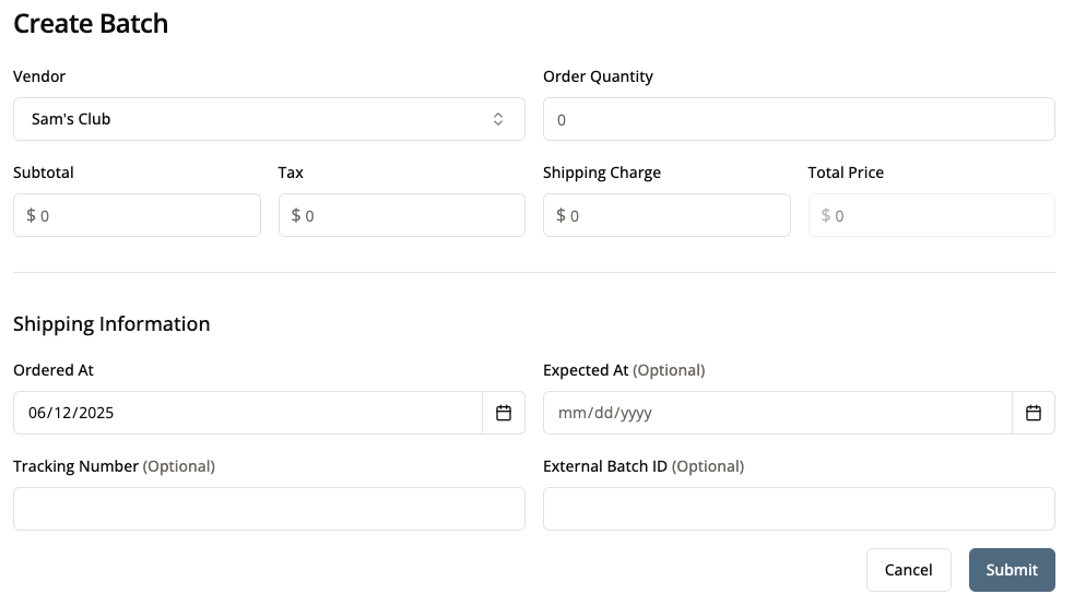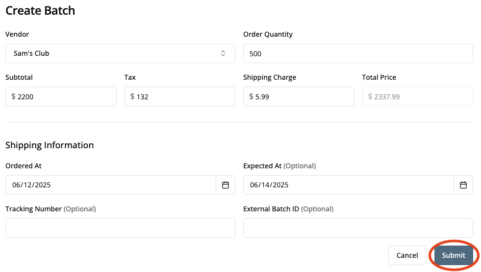 Clicking on “+ Add Batch” will have taken you to this page, which will ask you to fill out the information from this product’s most recent order.