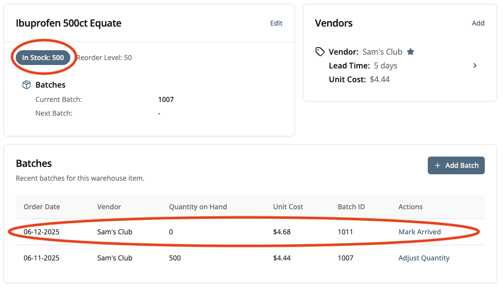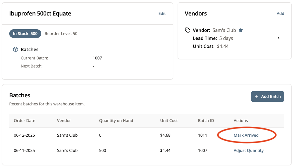 To do this, find your order in the Batches list and click “Mark Arrived” under actions. This will indicate to the system that inventory can now be updated.