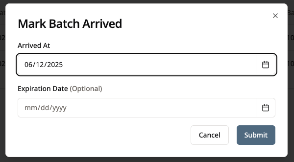 Once you click “Mark Arrived,” a pop-up will appear asking you to mark when the product arrived and any known expiration dates for the product.